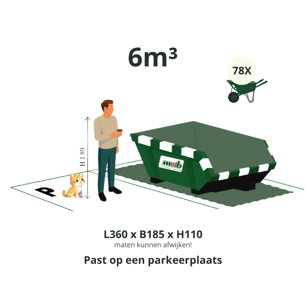 Huur een 6 m³ container voor uw opruimklus, verhuizing of (middel)grote renovatie. Dit formaat biedt nét wat meer ruimte en is ideaal als u meer volume verwacht, maar nog geen grote container nodig heeft. Bij Milieu Service Brabant huurt u voordelig en compleet: levering en ophalen inbegrepen. U bestelt eenvoudig online, wij plaatsen de container op de gewenste locatie en halen ’m weer op zodra u klaar bent.